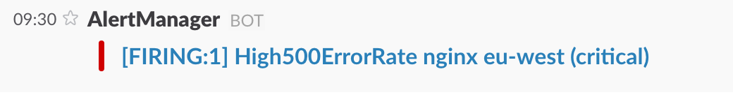 It shows us that there is one firing alert, followed by the label values of the alert grouping (alertname, datacenter, app) and further label values the alerts have in common (critical).